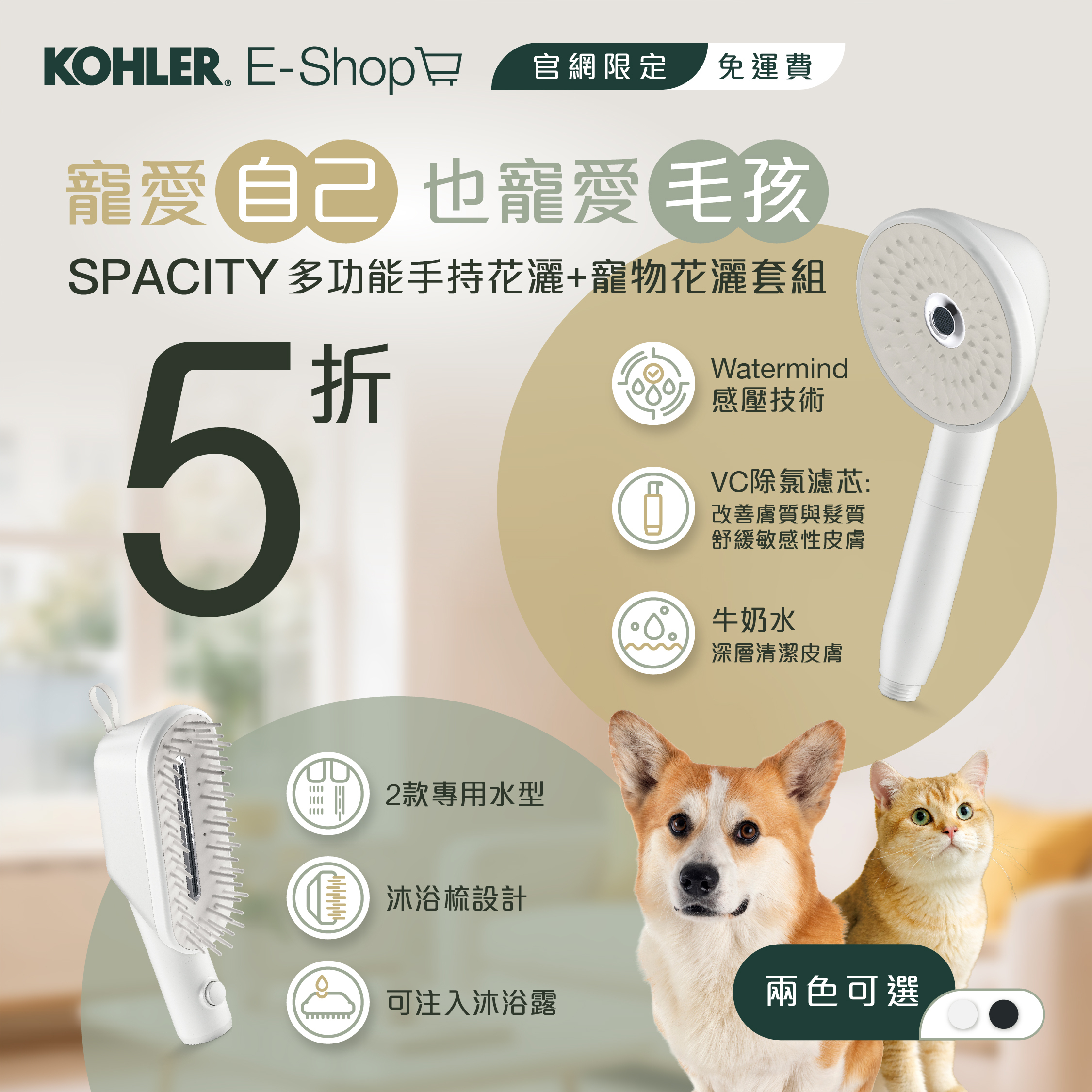 珍惜寵物家人,展現更多愛意!寵物如家人般珍貴,從家居開始,為您的毛孩家人獻上頂級沐浴享受。Kohler Spacity 寵物手持花灑系列,帶來高端毛孩居家SPA體驗!在家就能盡情寵愛,讓每回淋浴皆是奢華時刻,輕鬆照顧「家人」。