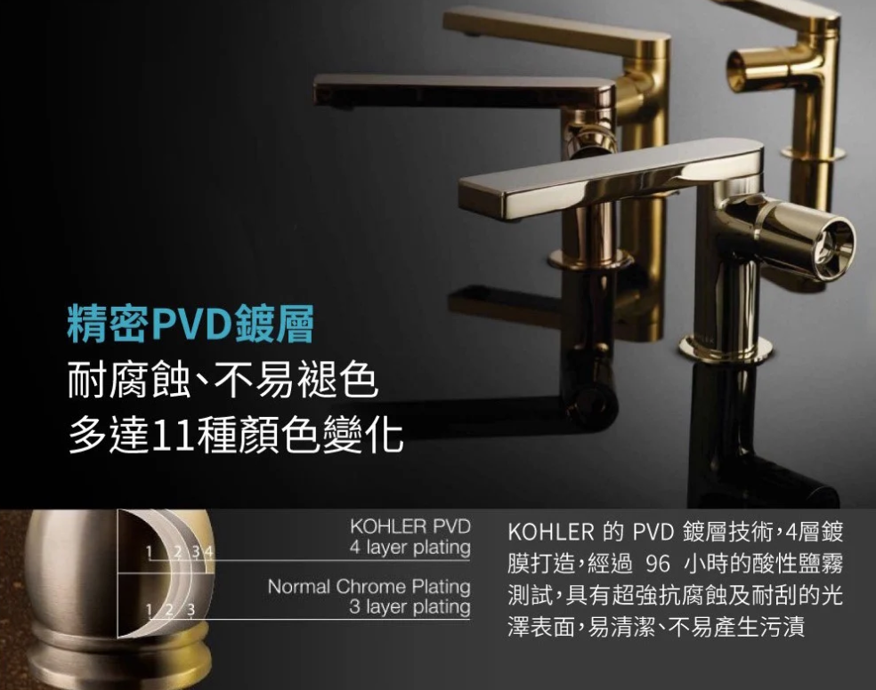 功能- 單把手設計,可控制開關、水量及溫度 - 把手上的紅/藍指示標識 - 出水嘴高度 3-13/16 吋(97 mm) - 出水嘴伸出長度 4-11/16 英吋(118 mm) - 在 60 psi (4.14 bar) 壓力下,最大流量為 2.2 加侖/分鐘(8.3 公升/分鐘) - KOHLER® 陶瓷閥芯的使用壽命超越業界標準,經久耐用 - 帶尾管的按壓式排水裝置 - 包含安裝配件 安裝方式 - 檯面安裝 - 單孔安裝 材質 - 採用優質金屬結構,經久耐用,性能可靠 - KOHLER 表面處理工藝,耐腐蝕、防褪色